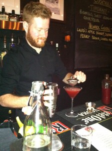 Next, I tried the Red Cross, a concoction of Four Roses Bourbon, Campari, Cinzano Sweet Vermouth, fresh blood orange juice, simple syrup and Peychaud’s & Regan’s Orange Bitters. Manis turned absolutely giddy when he started talking about the blood orange in this drink. It’s his favorite flavor, and with good reason. It worked really well in this cocktail, balancing the bitter Campari and making the drink nice and wintery.