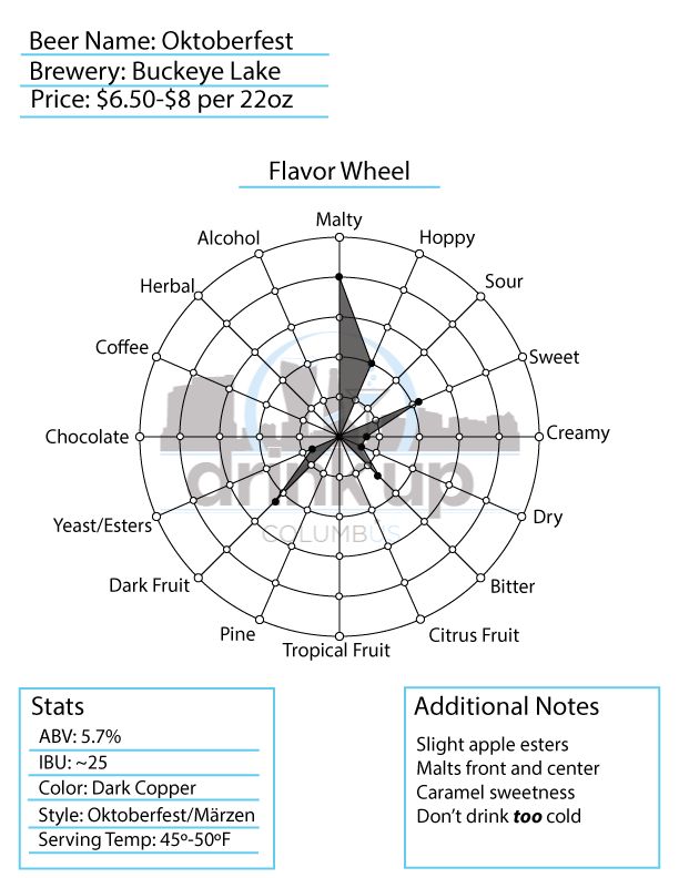 Fear not, for there is a beer perfectly suited to guide us all through this yearly transitional phase – the Oktoberfest (also known as Märzen). As the name says, this style of beer is typically served during the celebration of Oktoberfest (held at the end of September). And wouldn’t you know, this happens to fall right in the middle of the Summer beer/Autumn beer crossroads. This year, our friends over at Buckeye Lake Brewery have delivered their Oktoberfest, to guide us through these times of confusion.